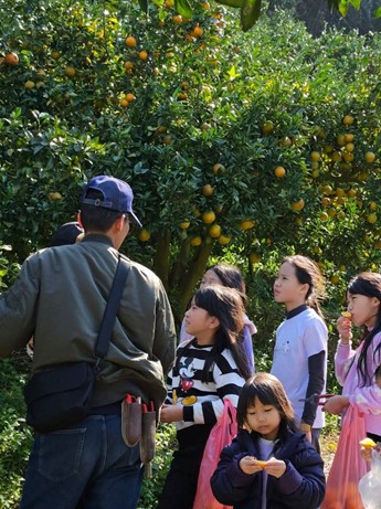 談起橘子,營主語氣變得明亮。哪一種甜度高、哪一種果皮薄、哪一種屬於晚生種,他都記得清清楚楚。不同品種錯開採收期,讓果園在不同季節都有收成,也讓來訪的遊客總能遇見屬於當季的橘香。